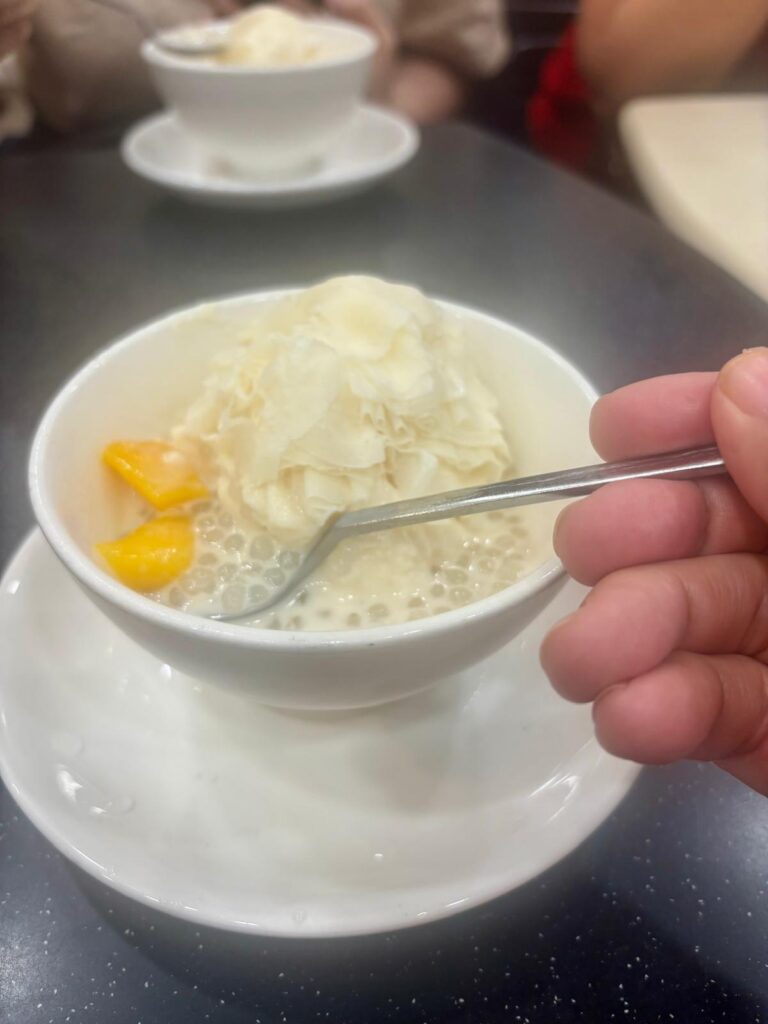 We also had something sweet. A serving of homemade shaved vanilla ice cream with sweet mango in tapioca milk. This creamy delight is a modern twist on a nostalgic dessert, featuring finely shaved layers of velvety ice cream infused with vanilla floating amongst tapioca and mango. This treat is as refreshing as it is indulgent—a perfect palate cleanser between savory bites.